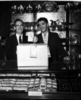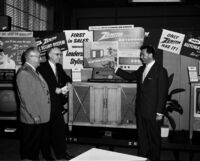 Zenith radio display A male sales representative talks to two men about Zenith radios.They are standing in front of a display possibly at a store.