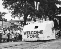 Welcome home float, Veterans Appreciation Day parade Onlookers viewing a welcome home float in the Veterans Appreciation Day parade July 4, 1946 in Chattanooga, Tennessee. Six unidentified girls riding on float also shown. Stamp on verso reads: "Photo by Allison Slagle."