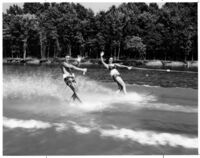 Water skiing on Chickamauga Lake Unidentified man and woman water skiing at the lake, waving to the camera. Some markings on the white trim of the photograph.