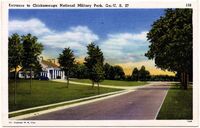 Visitor Center, Chickamauga Battlefield, Chickamauga and Chattanooga National Military Park Color postcard showing Visitor Center, Chickamauga and Chattanooga National Military Park; built 1936. Chickamauga and Chattanooga National Military Park, the first national military park, was created by an Act of Congress in 1890 and dedicated 1895. The majority of the park is located in Catoosa and Walker Counties, Georgia, but some sections are on Lookout Mountain, Tennessee, while others are in and around Chattanooga, Tennessee. Printed on postcard: "Entrance Chickamauga National Military Park, Ga-U.S. 27," and "Copyright W.M. Cline."