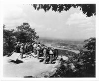 Visitors at Point Park, Lookout Mountain Group standing near cannons at Battery Point. Point is part of Chickamauaga and Chattanooga National Military Park created by Act of Congress in 1890 and dedicated in 1895. Stamped on verso: "Chattanooga Convention and Visitors Bureau, Memorial Auditorium, 399 McCallie Avenue. Chattanooga, Tennessee."