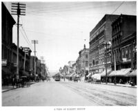 View of Market Street Looking north up Market Street from 8th Street in Chattanooga, Tennessee. On the right are D. B. Loveman's, Lookout Novelty Shop, and Schwartz Shoes. The Fischer and Brothers clock can be seen on the left. Originally published in Art Work of Chattanooga, Tennessee (Gravure Illustration Co., 1906).
