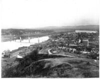 View from Boynton Park Looking northeast at Chattanooga from Boynton Park on Cameron Hill. Shown are the Tennessee River, the Walnut Street Bridge, Loomis and Hart, White Oak Distillery, and Chattanooga Brewery. Originally published in Art Work of Chattanooga, Tennessee (Gravure Illustration Co., 1906).
