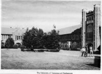 University of Tennessee at Chattanooga Quadrangle, University of Tennessee at Chattanooga located at 615 McCallie Avenue, Chattanooga, Tennessee. Founders Hall on left and Race Hall on right. Originally Chattanooga University 1886-1888, name changed to Grant University 1889, and then to the University of Chattanooga in 1907. Becomes University of Tennessee at Chattanooga in 1969. Photo used in Chattanooga News-Free Press 1982 calendar. Negative has been cropped.
