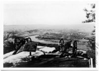 View from Battery Point, Lookout Mountain View of distant Chattanooga from Garrity's Alabama Battery site. Cannons and plaques are in photo. Battery Point part of Chickamauga and Chattanooga National Military Park, created by Act of Congress in 1890 and dedicated in 1895. Photo has some silvering on right side and the word "photography" written on right side. Photo is faded at the top.