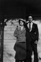 Young couple on porch Photo is of a photo of the couple, possibly from scrapbook, photo is cropped to original photo size. -