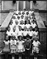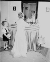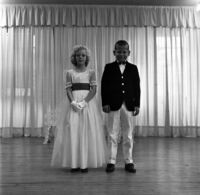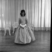 Young girl in fancy dress, possibly Communion dress -