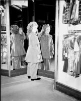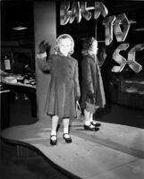 Young lady models a coat for a "Back to School" sale -
