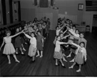 Young girls dancing Dance could be a folk dance or the minuet. -