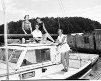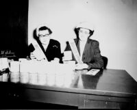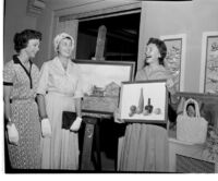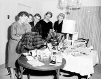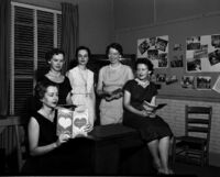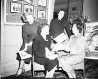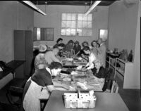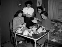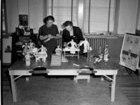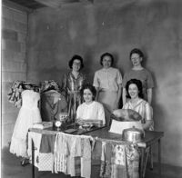Women making outfits for dolls Photo shows several women creating doll clothes, possibly part of a club. -