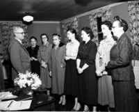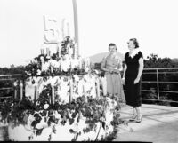Women with 50th anniversary cake Celebration could be for Girls Preparatory School. -