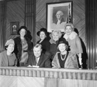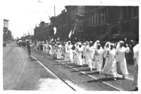 Women service organizations in parade Women service organizations (may be Red Cross or the Godmothers) in the Bastille Day Parade on Market Street between 7th and 8th Streets in Chattanooga. Photograph from one volume of eight scrapbooks compiled by E. Y. Chapin, Walter Cline, and Frank F. Stoops of the Chattanooga Half Century Club. -